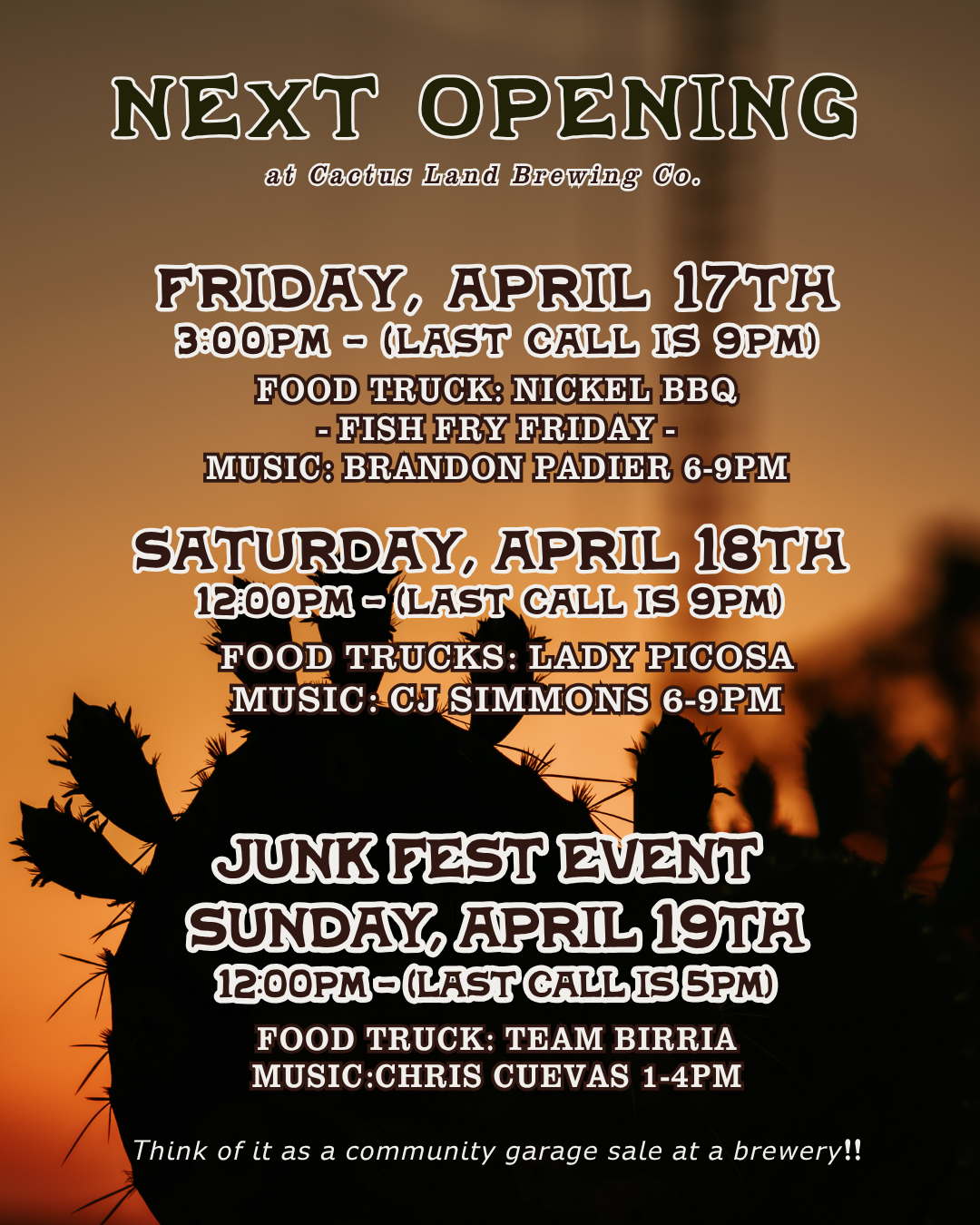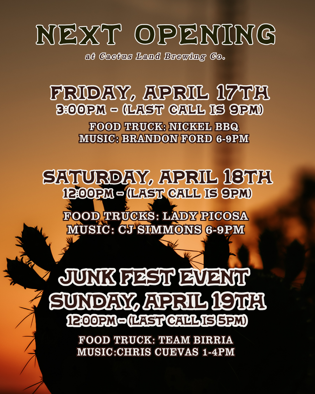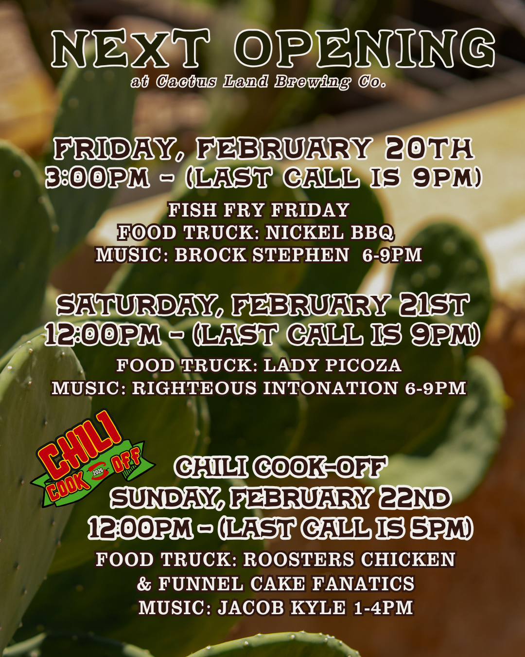 Enjoy craft beers and fun at Cactus Land Brewing Co.! Open the 1st and 3rd weekends of the month, we offer reserved taproom seating, cozy Side Bar, and cornhole. Perfect for groups, friends, or a casual outing. Don't miss out on the ultimate brewery experience. Book now!