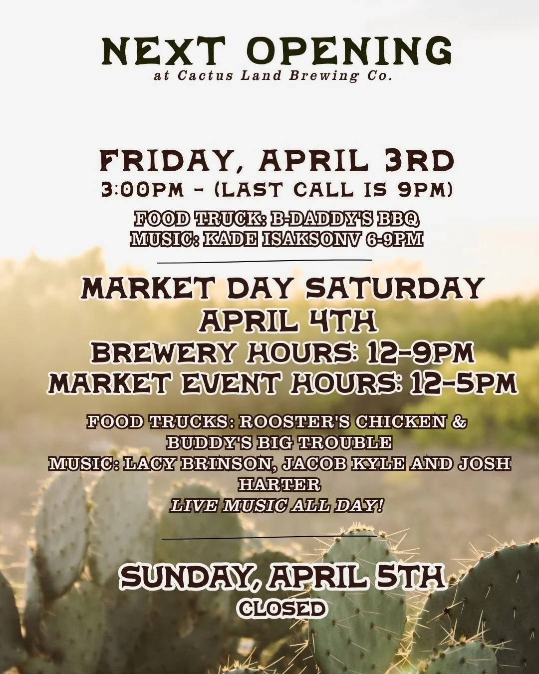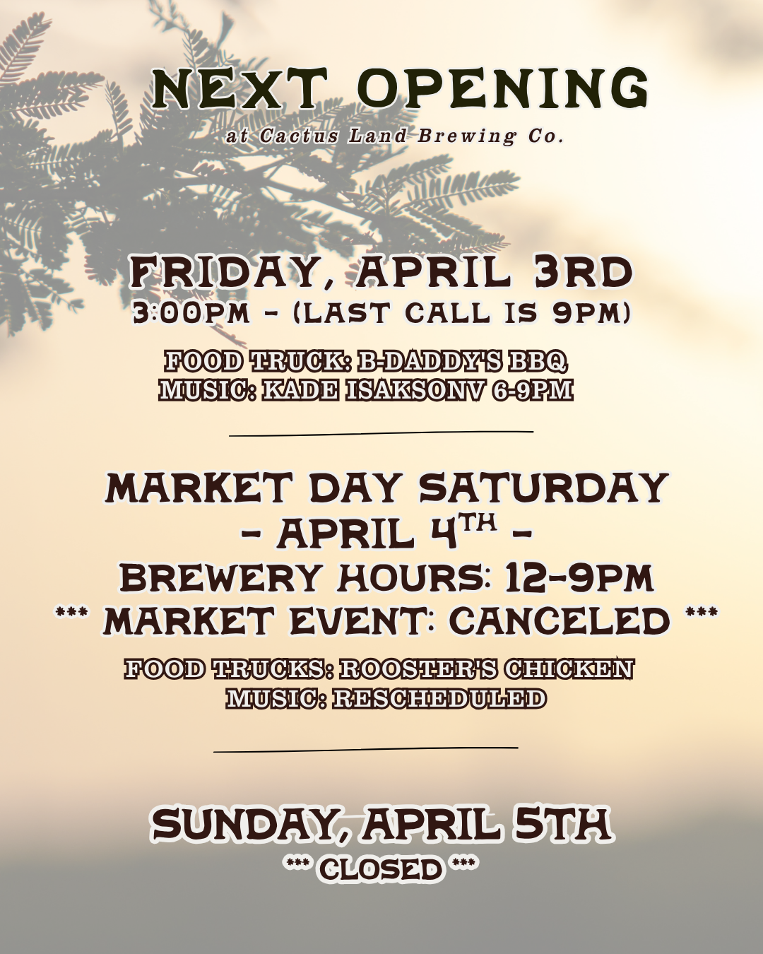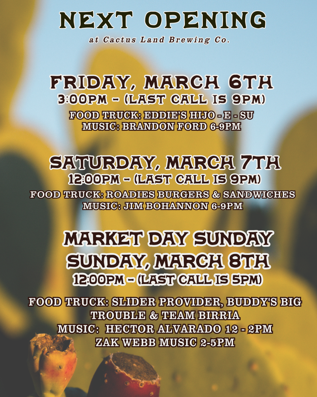 Cactus Land Brewing hosts a market day event at the brewery on the 1st Sunday the brewery is open every month. Market Day vendors range from fresh farm produce, boutiques, baked goods, wood working, leather goods and more. Come to sip, stroll and shop small!