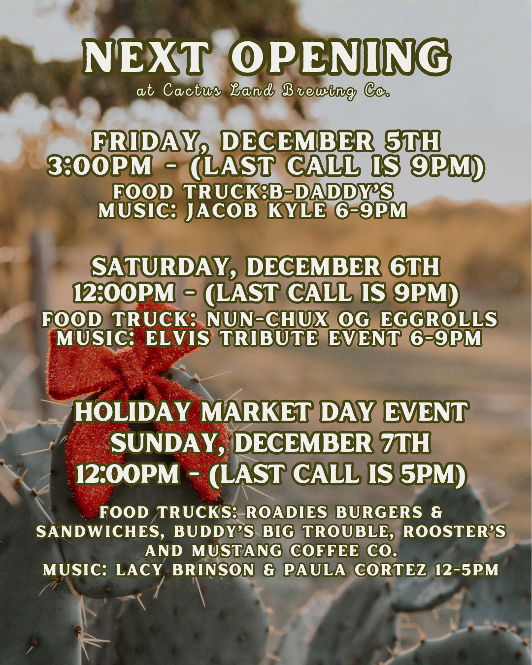 Cactus Land Brewing hosts a market day event at the brewery on the 1st Sunday the brewery is open every month. Market Day vendors range from fresh farm produce, boutiques, baked goods, wood working, leather goods and more. Come to sip, stroll and shop small!
